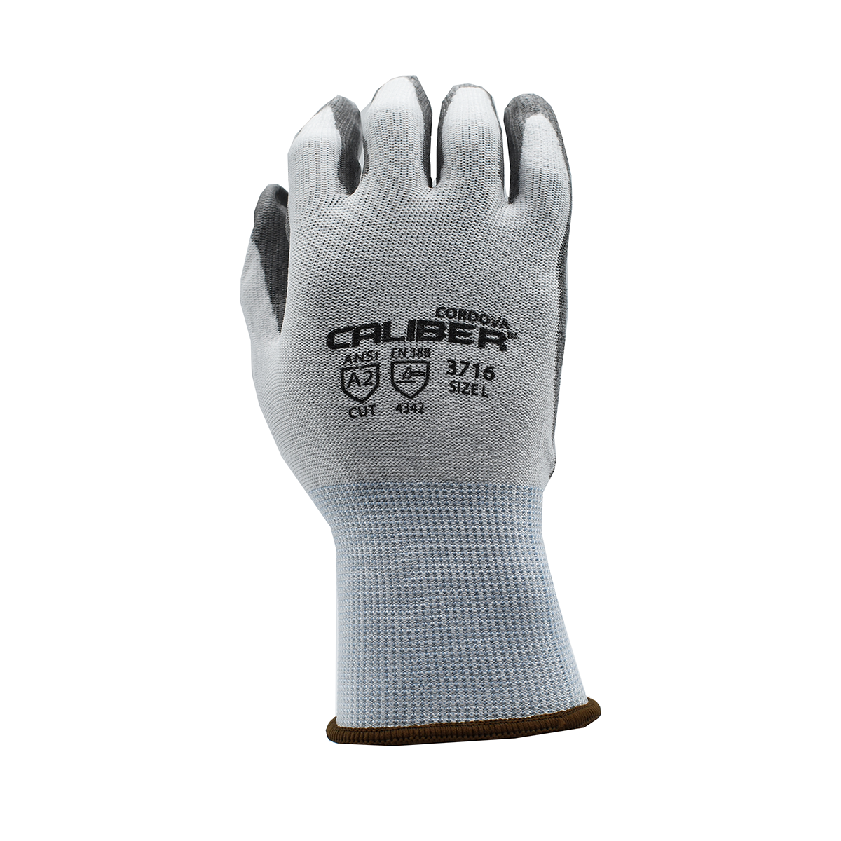 Caliber™ glove features a white, 13-gauge HPPE shell, gray, PU palm coating, and blue elastic wrist.