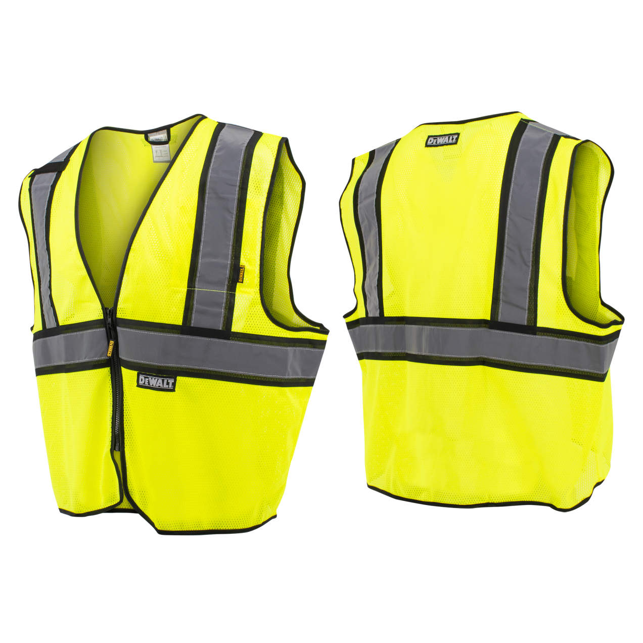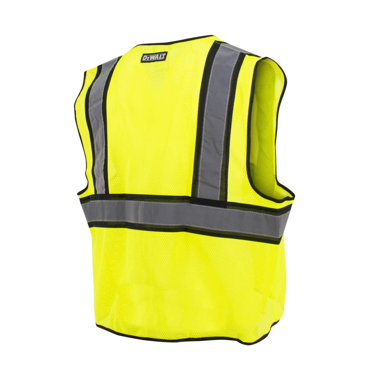 The DEWALT DSV221 Class 2 economy mesh vest with contrasting trim will help protect workers with a brand name they know and trust. The DSV221 is built with durable stitch reinforcement at major stress points providing Guaranteed Tough™ protection. The high visibility mesh material and the 2” sewn on reflective tape with contrasting trim helps provide visibility in both bright and low light conditions.