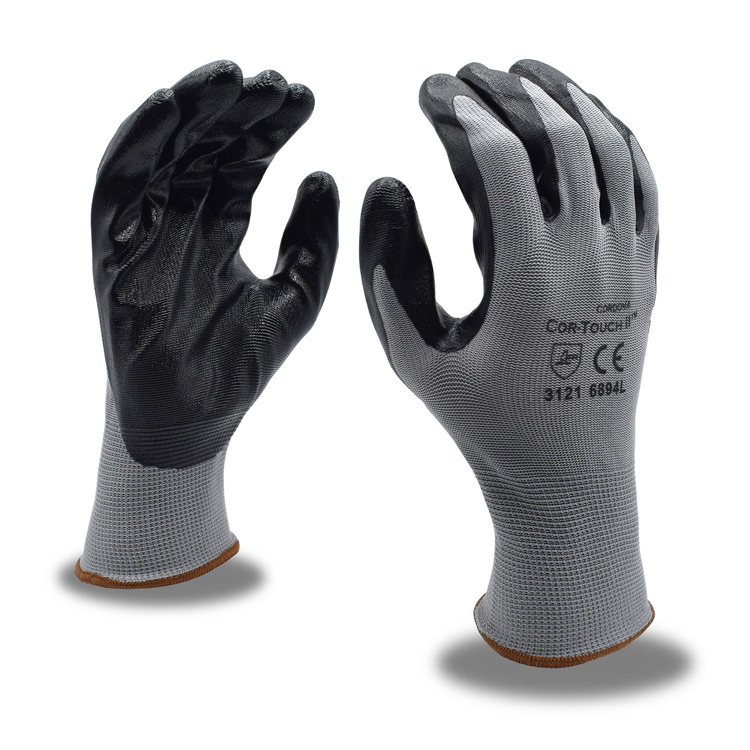 Nitrile is an oil-resistant, synthetic rubber that is abrasion-, snag-, and puncture-resistant. Machine knit, nitrile-coated gloves are incredibly durable and offer excellent sense of touch. Flat nitrile coatings are smooth, shiny and liquid-resistant. This Cordova Safety Products-brand COR-TOUCH II™ glove features a 13-gauge, gray, polyester shell and black, flat nitrile palm coating.