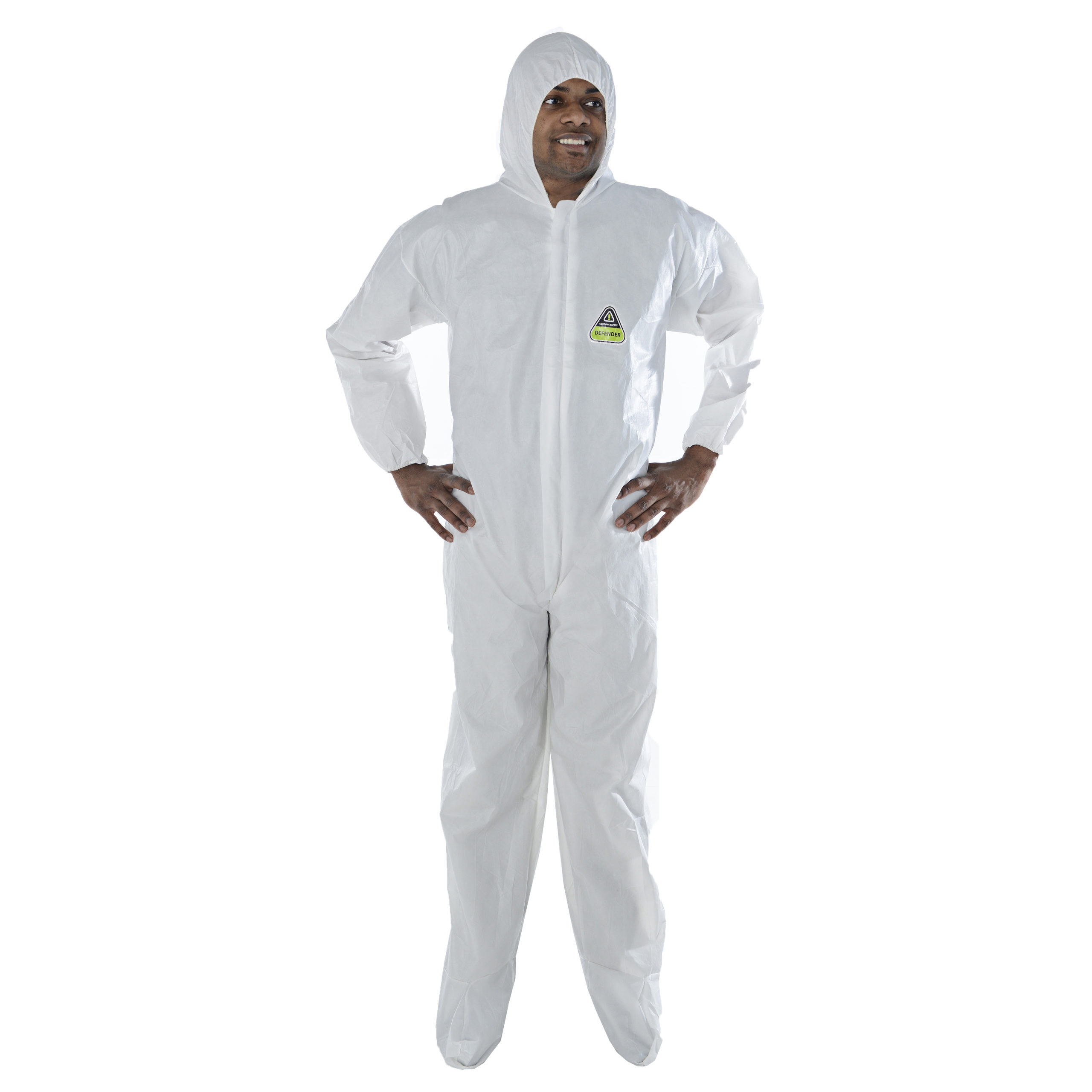 combines breathable microporous film and soft non-woven polyolefin. It provides an effective barrier against particulates, aerosols, and liquids while maintaining comfort. It is designed for work environments where hazardous and non-hazardous liquid and dry particulate contaminants may be present. This DEFENDER™, microporous, disposable coverall features serged seams, a zipper front, a hood and boots, and elastic at the hood, wrists, and ankles.