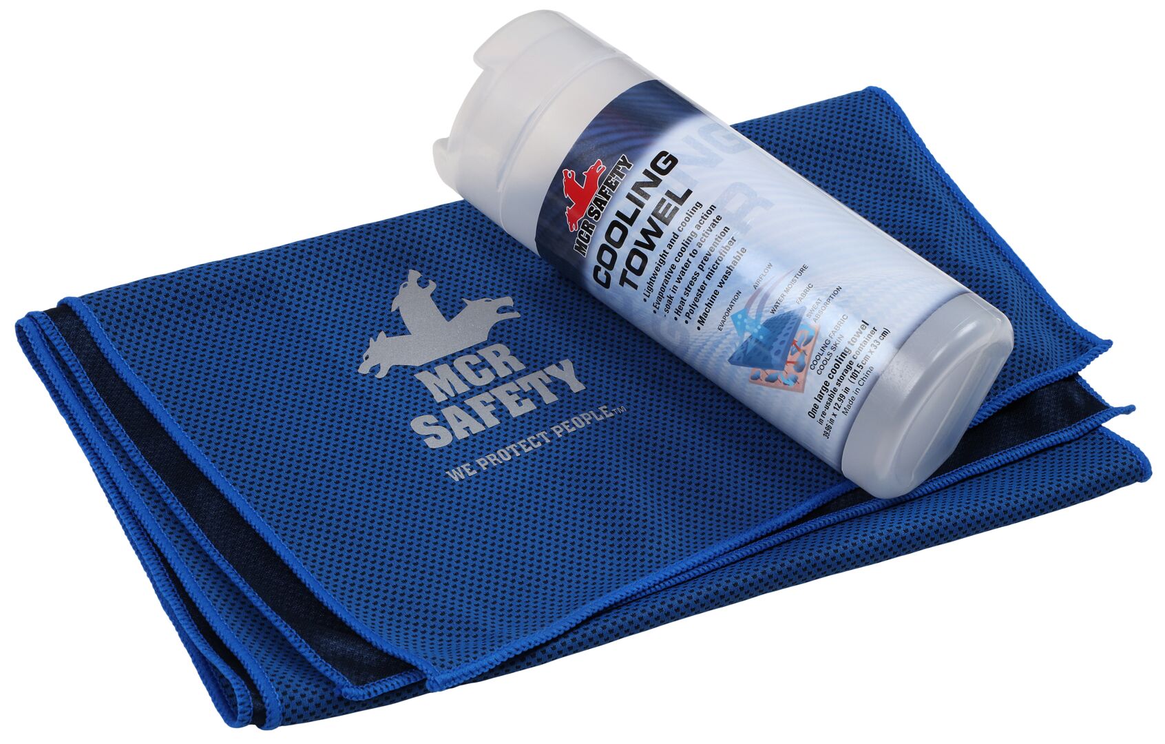 Reusable container to safely store after use Staying cool on the job is a large part of being safe! MCR Safety now offers a line of cooling gear that will help you stay safer and more comfortable on those warm and muggy days. The CGT13 is a large blue polyester microfiber cooling towel that measures 30 inches x 14 inches and will help make a difference on hot workdays! This cooling towel comes with a reusable storage container that will keep the towel safe and out of the way when not in use. Simply soak in water before use. The CGT13 is machine washable and reusable.