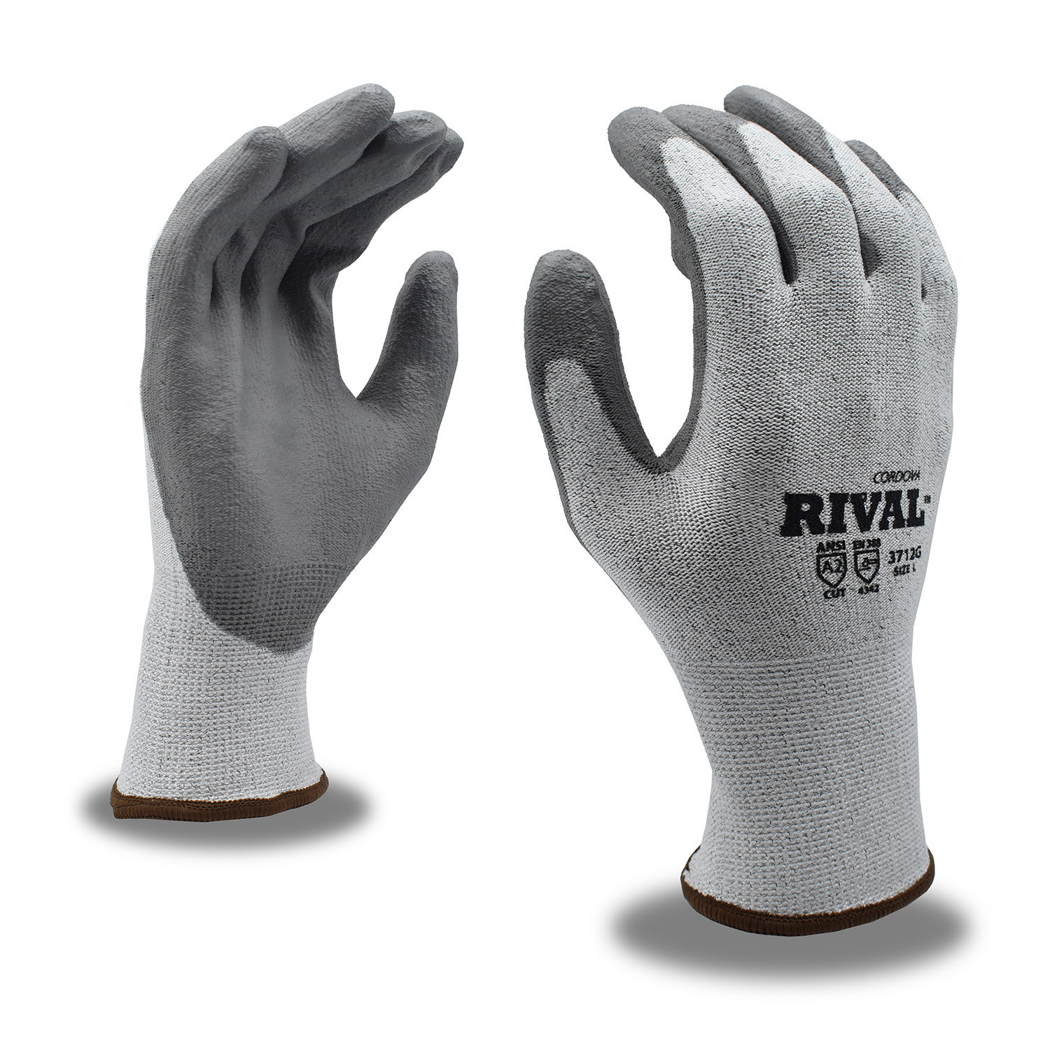High-performance gloves are machine knit constructed of high-strength yarns that provide increased levels of dexterity and abrasion- and cut-resistance. Most feature coatings to increase the durability and gripping power. High Performance Polyethylene (HPPE) has a tensile strength 15 times stronger than steel on an equal weight basis. Gloves made with HPPE are lightweight, comfortable and abrasion- and cut-resistant. Tests have shown that gloves made with HPPE fibers have up to 20 times the abrasion resistance of gloves made with spun Aramid yarns. The CORDOVA-brand Rival™ glove features a gray, 13-gauge HPPE shell and gray polyurethane (PU) palm coating. It offers an A2 cut level.