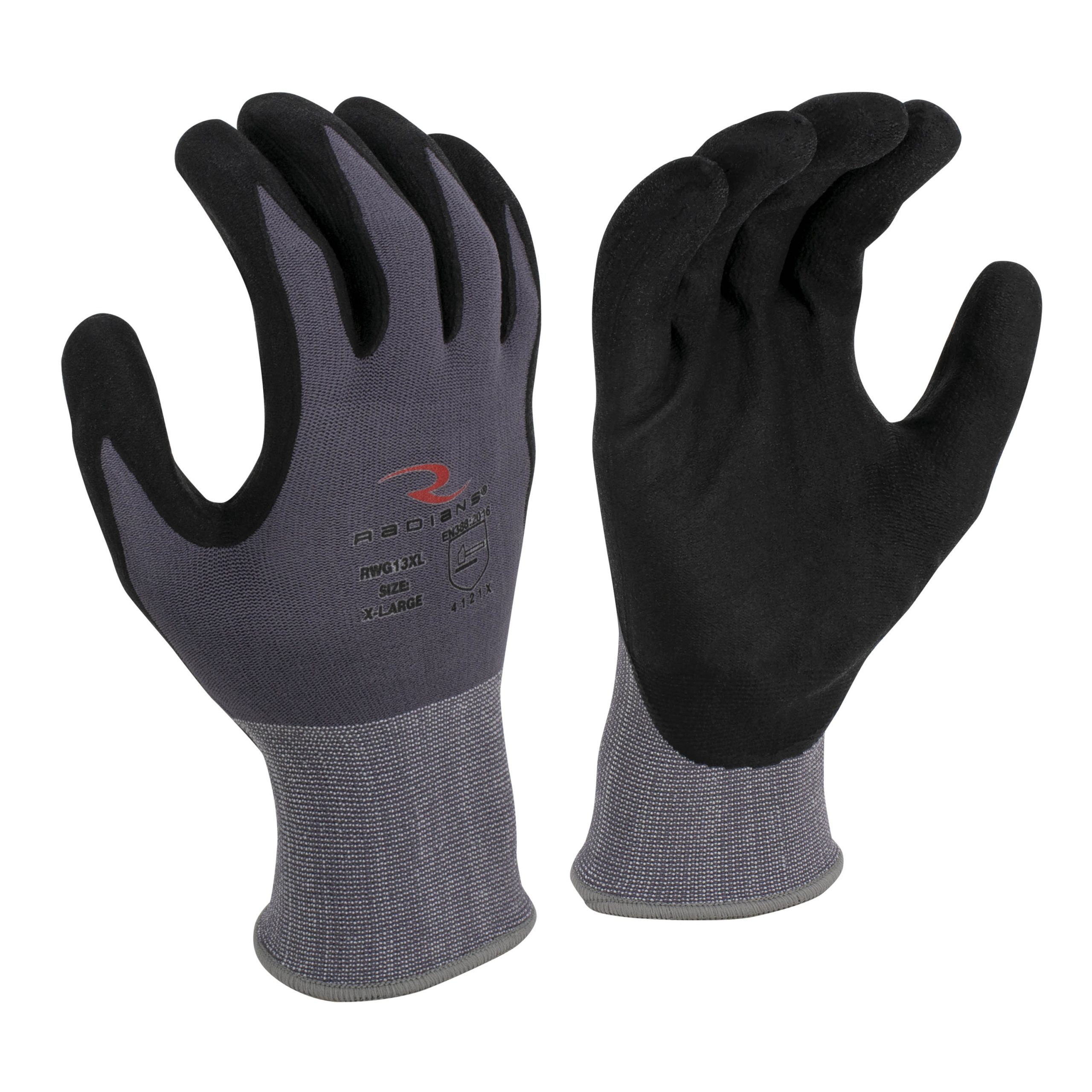 The Radians RWG13 is a foam dipped nitrile glove with a 15 gauge blended nylon/spandex shell. The elastic cuff provides a comfortable, slip-on fit while the foam dipped palm provides durability and a slip-free grip. An additional palm coating gives water resistance. Meets ANSI and EN388 standards.