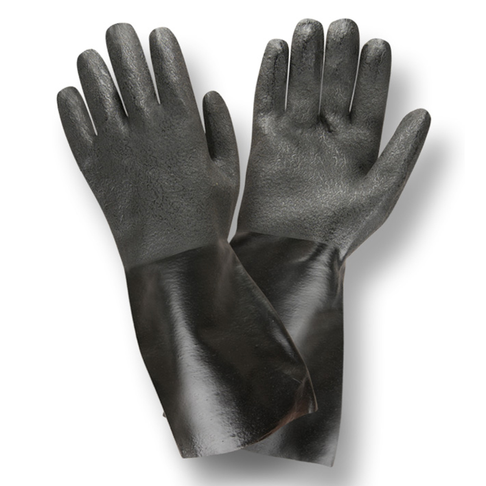 PVC provides protection against caustics, acids, bases, detergents and solvents. It offers excellent resistance to most acids, oils, animal fats, caustics, petroleum hydrocarbons, and alcohols. Double dipping provides extra strength and durability to the glove. This double-dipped, PVC glove features an etched finish, interlock lining, and a 14-inch length.