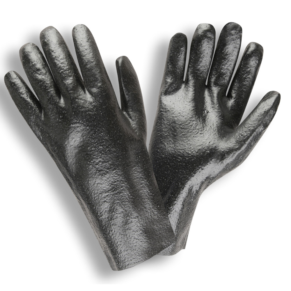 The rough finish on this PVC glove provides the largest grain surface for those applications where a strong grip is necessary. This glove also features an interlock lining and 12-inch length. PVC provides protection against caustics, acids, bases, detergents and solvents. It offers excellent resistance to most acids, oils, animal fats, caustics, petroleum hydrocarbons, and alcohols.