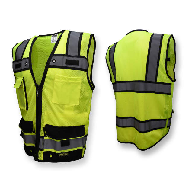 Radians SV65 Type R Class 2 Heavy Duty Contractor Surveyor’s vest is built with rugged ANSI 107 high visibility material, reinforced wear points and long-wearing web reinforcements along out edges. The SV65 includes a zipper closer and a large back “plan” pocket, mesh material for breathability and comfort, and pockets in tough woven twill fabric to provide maximum durability.