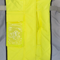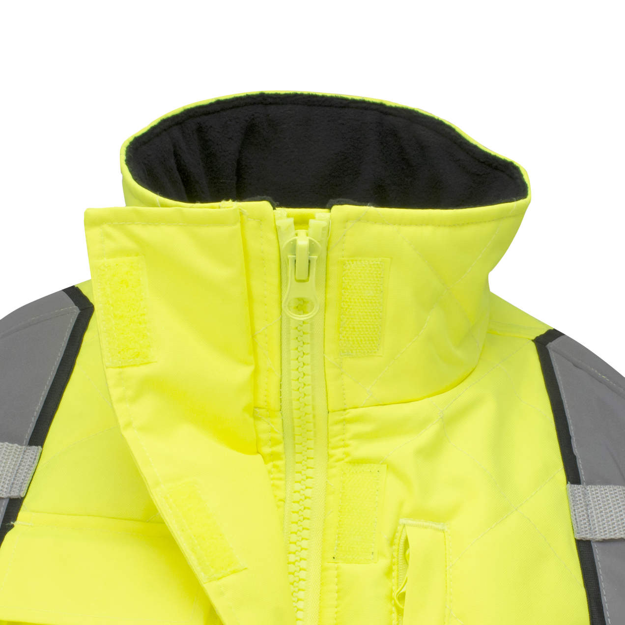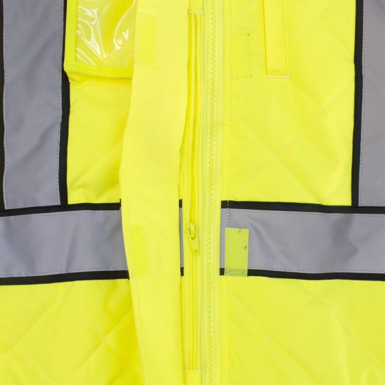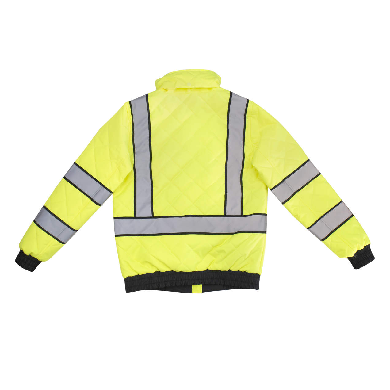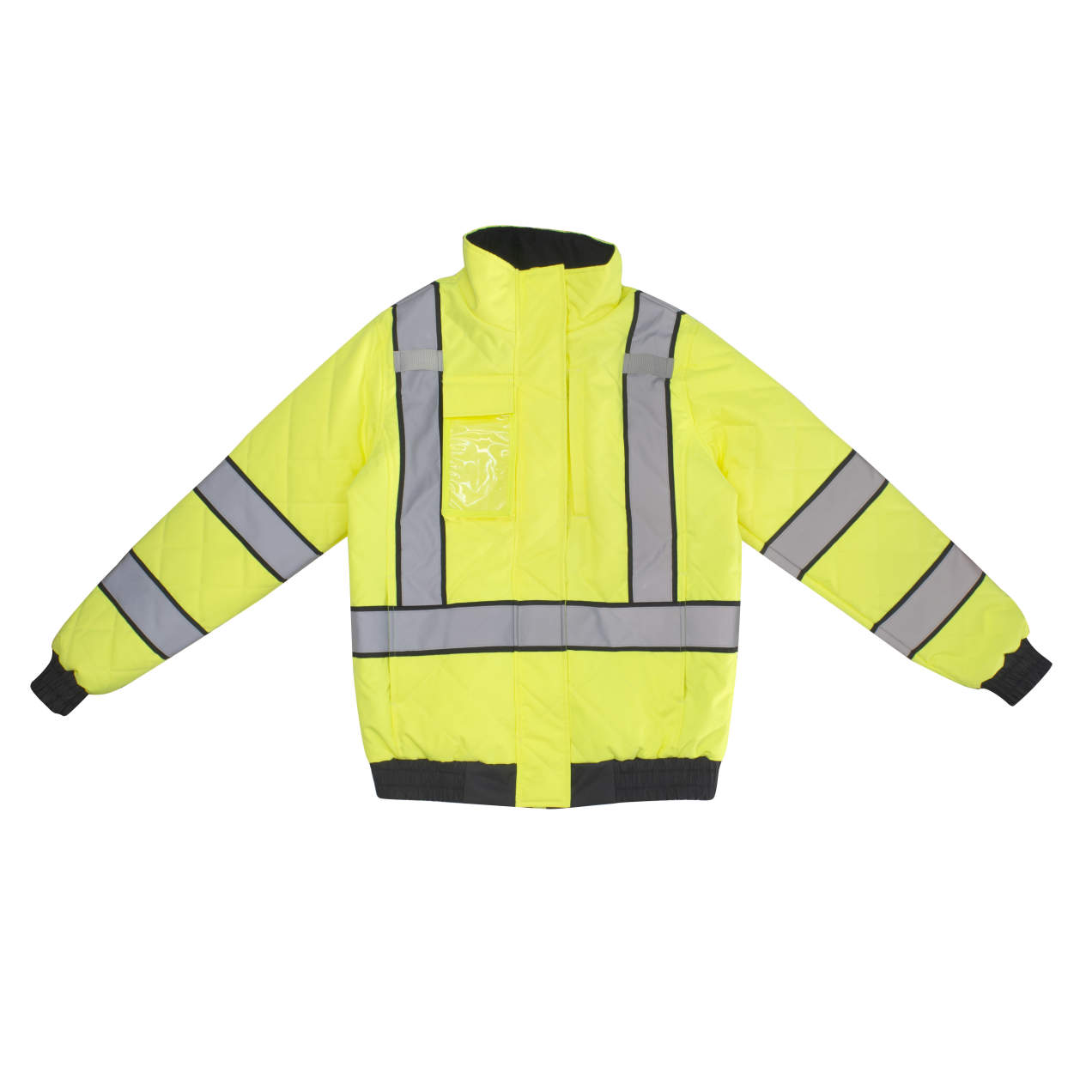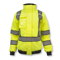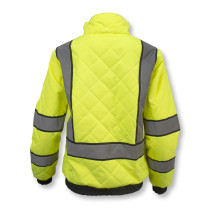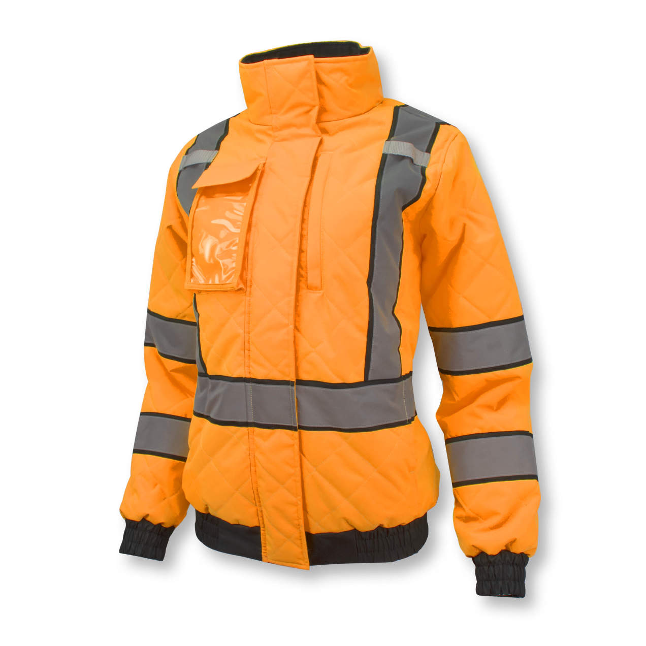 The Radians SJ930-3 Women’s Class 3 Quilted Bomber Jacket has a Diamond Quilted PU Coated polyester outer shell, a fleece lined body, and taffeta lined sleeves for easy on/off. A front storm flap and high collar add extra warmth and protection from the elements. It is a Class 3 high visibility rating with silver reflective tape and black contrast trim. Pockets include a radio/phone pocket with clear id pocket, zipper chest pocket, lower hand warmer pockets with zippers, hidden tablet/accessory pocket under storm flap to secure important items, and an inner chest pocket. Features also include a detachable roll away hood with toggle draw cord, and elastic waist and cuffs to help block the cold.